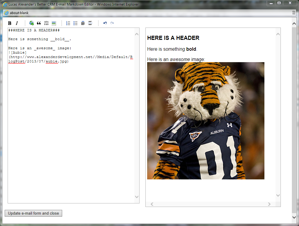 Last month I wrote a post called A Better Dynamics CRM E-mail Editor With TinyMCE in which I showed how to create a better Dynamics CRM e-mail editing interface using TinyMCE. Since then I have done some work with Markdown, and I decided it would be an interesting exercise to make a Markdown-enabled e-mail editor. For typical CRM users, the TinyMCE editor is probably the better approach for e-mail editing, but I think Markdown is a useful, light-weight HTML editing solution, and this overview will show how easy it is to get working inside Dynamics CRM.