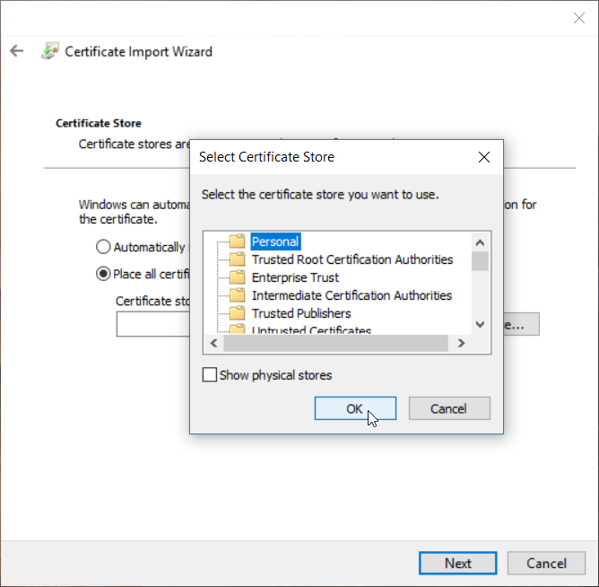 Once you have generated your two SSL certificates, you need to install them on the local PC. If you followed the directions from the blog post above to generate your certificates, you should have a public certificate for your root CA as a .cer file and a private certificate to use for the application as a .pfx file.