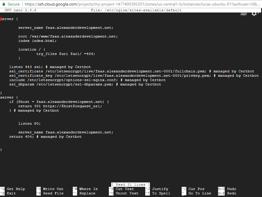 - Update the content of your Nginx config file (/etc/nginx/sites-available/default) with the following, replacing the "faas.alexanderdevelopmen.net" entries with the correct falues for your domain and directory: